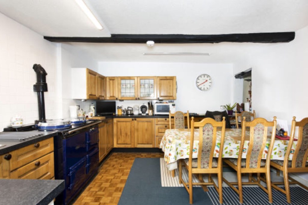 Estate Agent’s pic of the kitchen. The good: Aga, parquet, and beamed hatch to the lounge. The bad: damp along the far wall, past their prime kitchen cabinets, asbestos artex ceiling, and the plumbing.