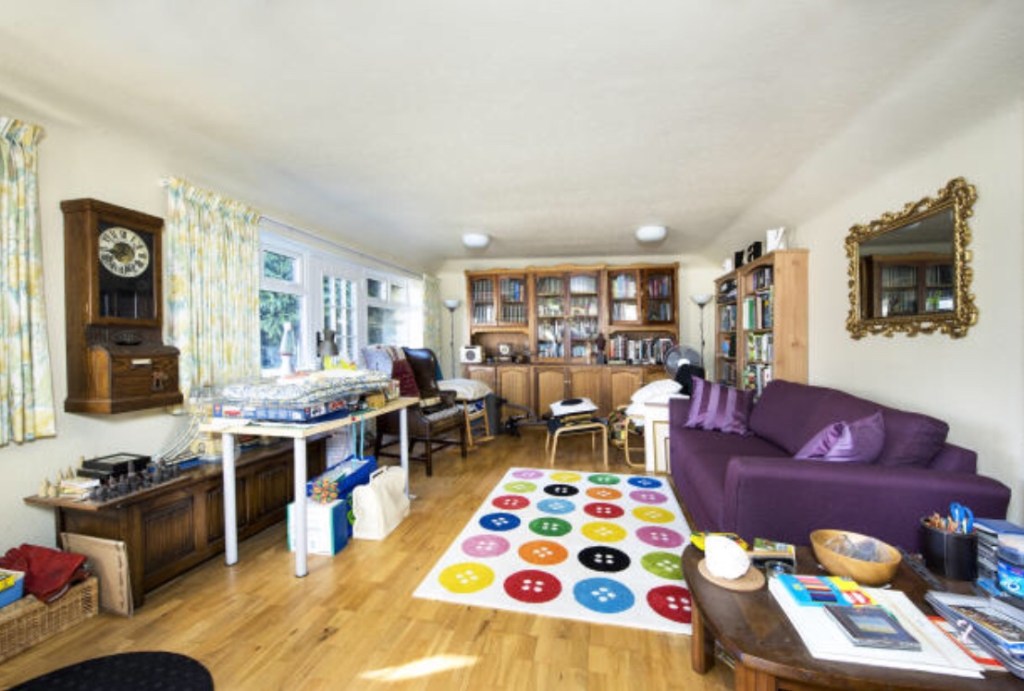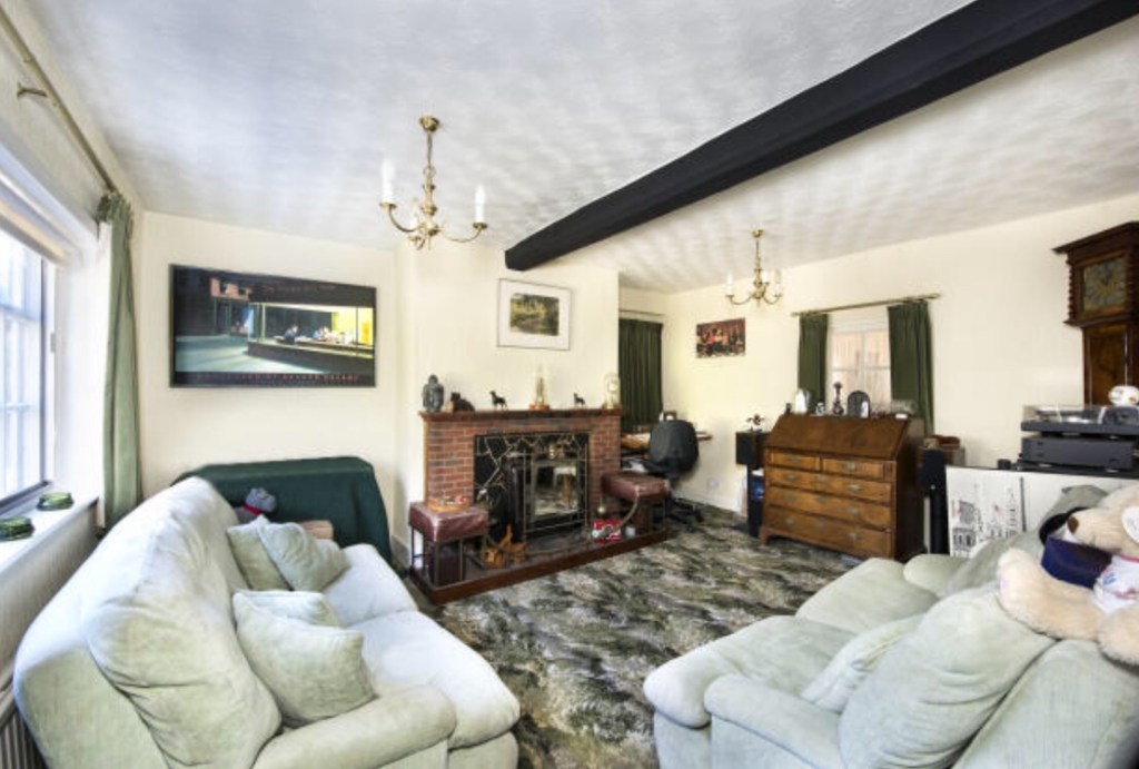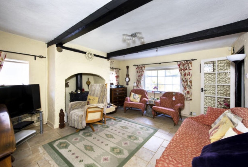 Estate Agent’s pic of the lounge. What you can’t see clearly is the original, huge, spectacular log burner, or the texture of the plaster on the walls.